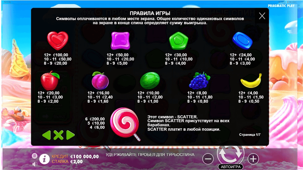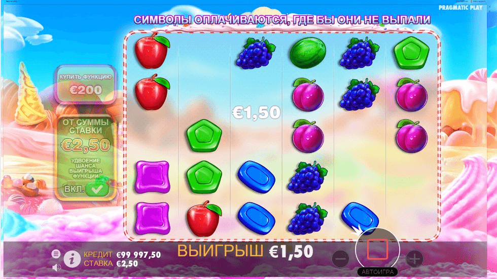 Símbolos: O jogo apresenta vários símbolos doces, como frutas, rebuçados e doces. Estes símbolos coloridos contribuem para a atmosfera alegre e vibrante do jogo.